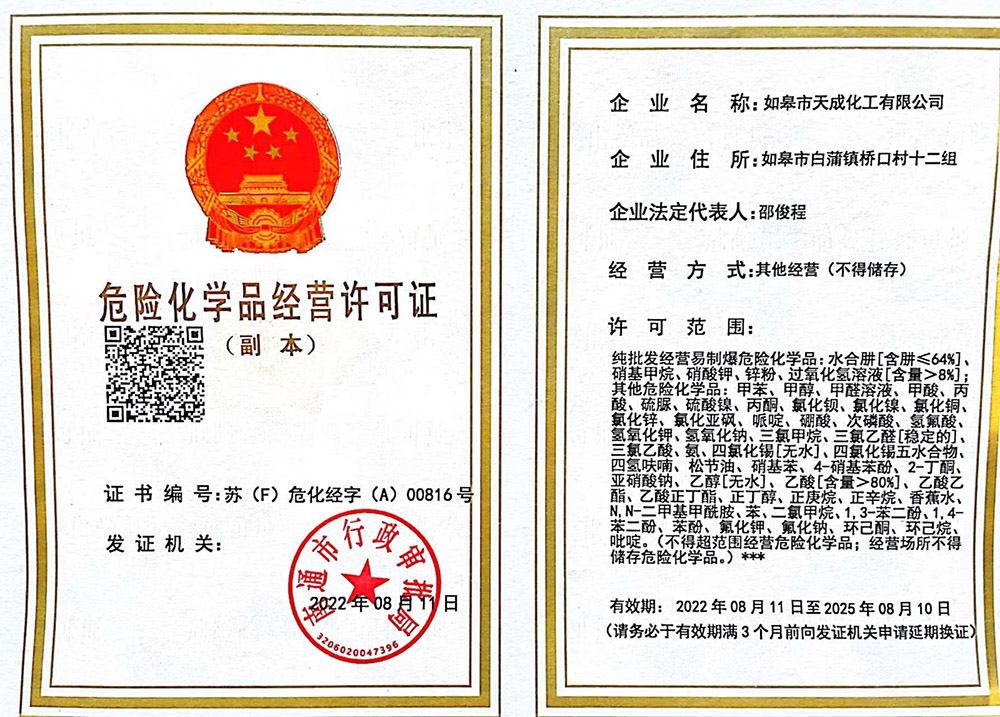 ? 如皋市天成化工有限公司創(chuàng)建于1996年。公司地處于美麗富饒的長江三角洲,座落在古鎮(zhèn)林梓,通揚運河河畔。南瀕長江、西臨204國道,距南通港、飛機(jī)場30公里,立體交通發(fā)達(dá)。公司經(jīng)營管理規(guī)范,技術(shù)力量雄厚,擁有一批高、中級專業(yè)技術(shù)人才。